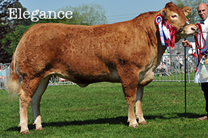 Dinmore Elegance is a very powerful October 2009 Vantastic heifer out of Carmorn Voney the two times Balmoral Interbreed Champion 2006 and 2007. Elegance won her class at the National Show and went on to win at the Royal Welsh 2011. In 2013 she won various interbreeds at Cheshire, Shropshire, Burwarton, Monmouth and became Reserver Overall Champion at the Royal Welsh Show. She also won Limousin pairs and the Interbreed Team of Five.